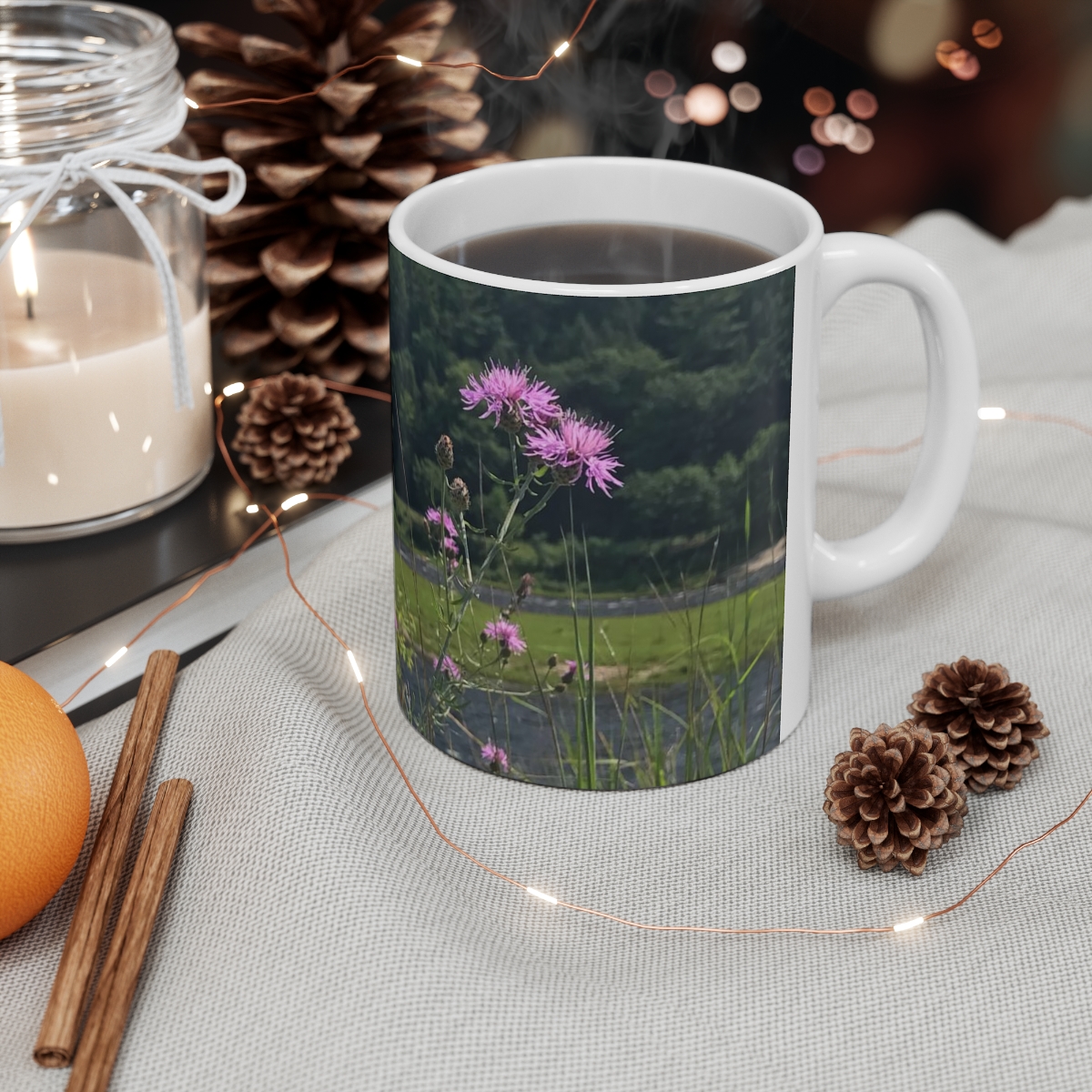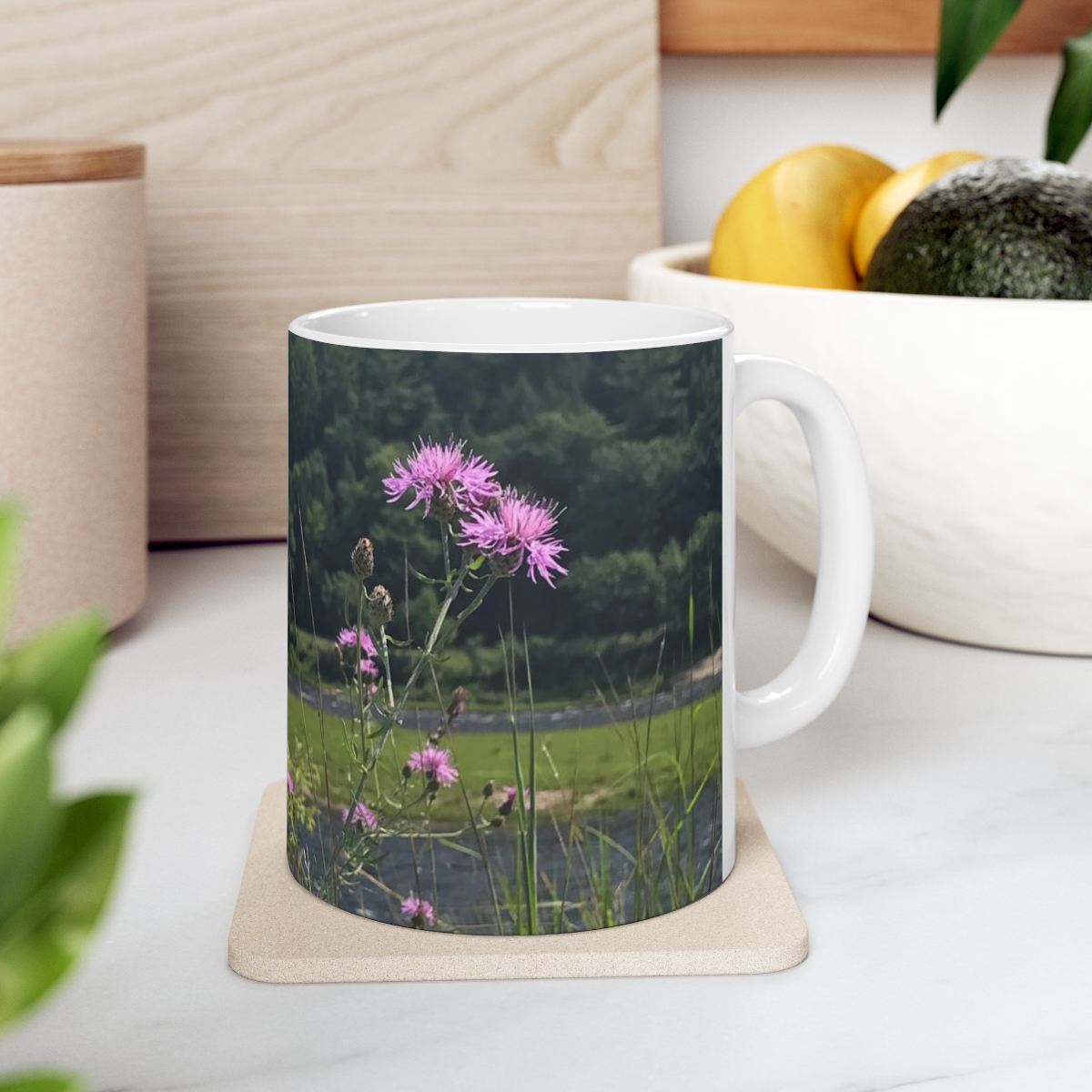 Warm-up with a nice cuppa out of this scenic ceramic coffee mug. It’s BPA and Lead-free, microwave & dishwasher-safe, and made of white, durable ceramic in 11-ounce size. The perfect gift for coffee, tea, and chocolate lovers.